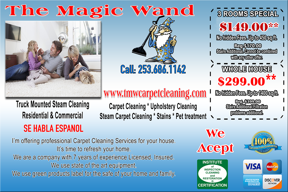 The Magic Wand Cleaning, LLC Company takes ride in every customer they service. We are a full service carpet and water restoration company. Serving all Seattle to Federal way-Kent area. If you are looking for a company that will make sure your carpets and Rugs look their best put their service to the test. We are happy to take on any job no matter how big or small. Carpet cleaning is what we do!!!! If you have Stains that no one has gotten out let The Magic Wand Cleaners make them disappear.